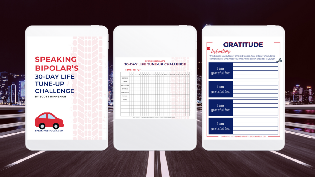Speaking Bipolar’s 30 Day Life Tune Up includes a 21 page PDF workbook, tracker worksheet, and gratitude worksheet to help you remember what’s most important.